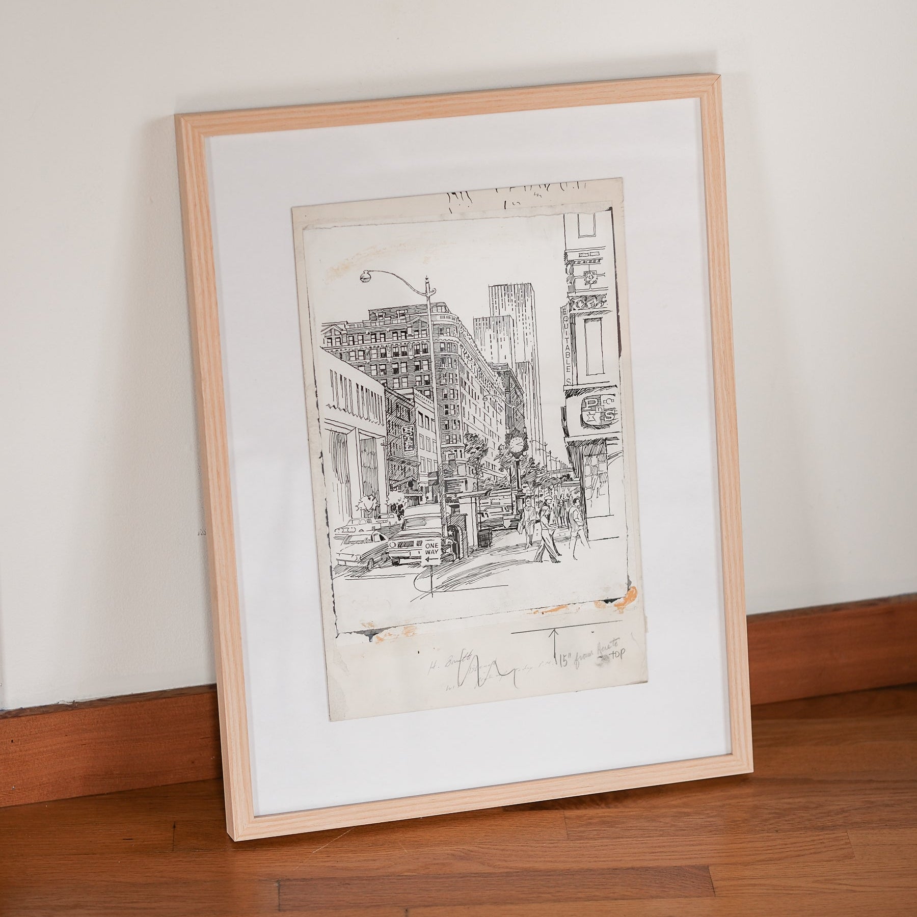 Coliseum Theater: Ink Drawing looking down 5th Ave towards the Coliseum Theater, and the first Washington Plaza Hotel tower. Signed by Harry Bonath, 1975.