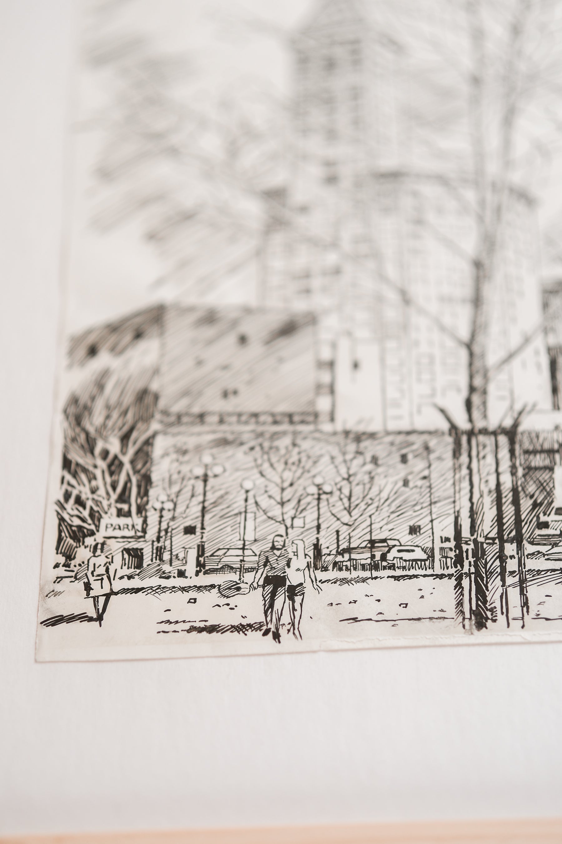 Shown on our walls are three of his original ink drawings of Downtown Seattle from the 1970s.
