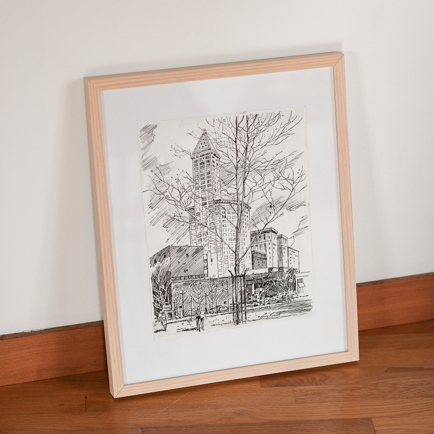 Smith Tower: Ink Drawing of Smith Tower showing a couple walking. Signed by Harry Bonath, 1975