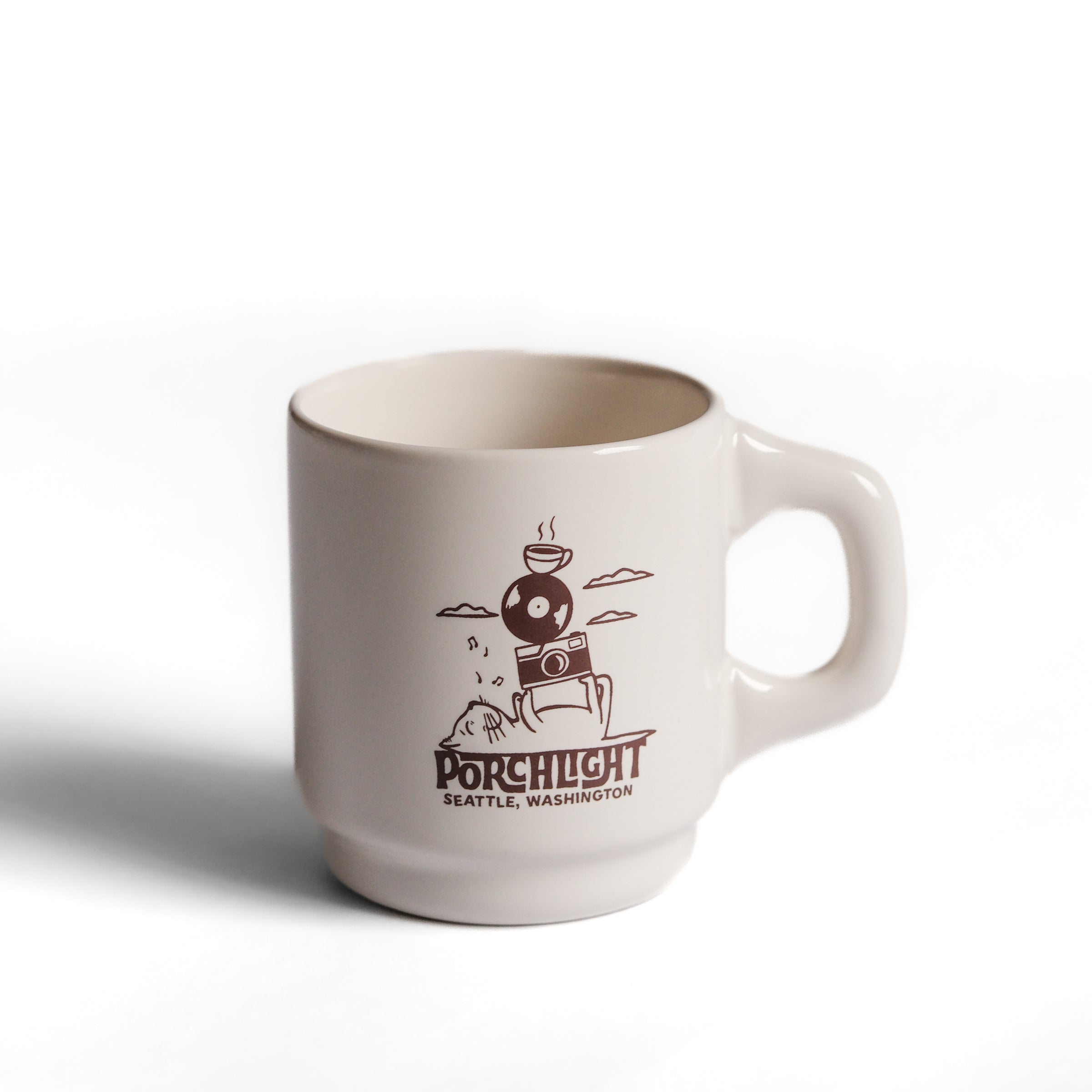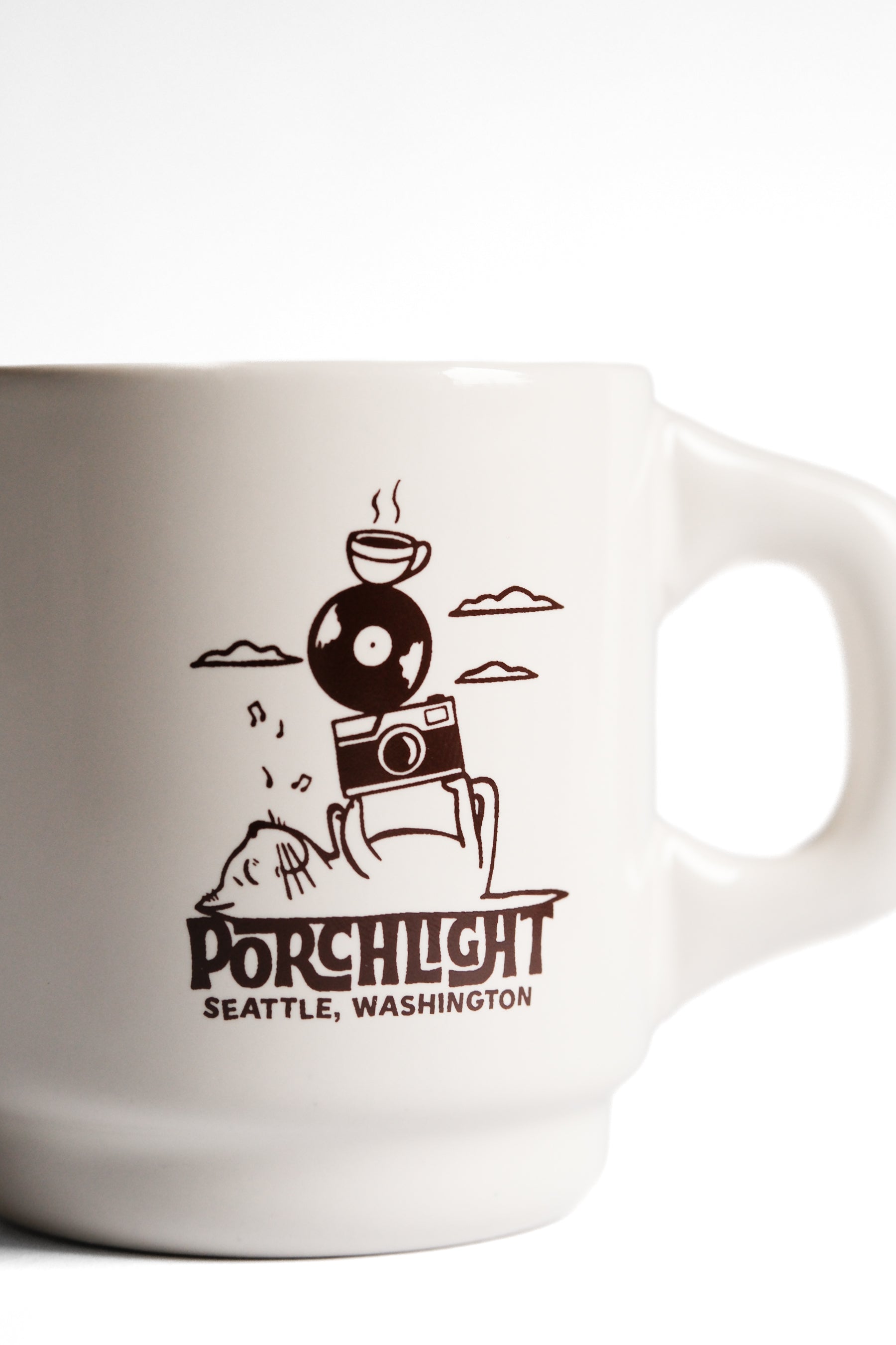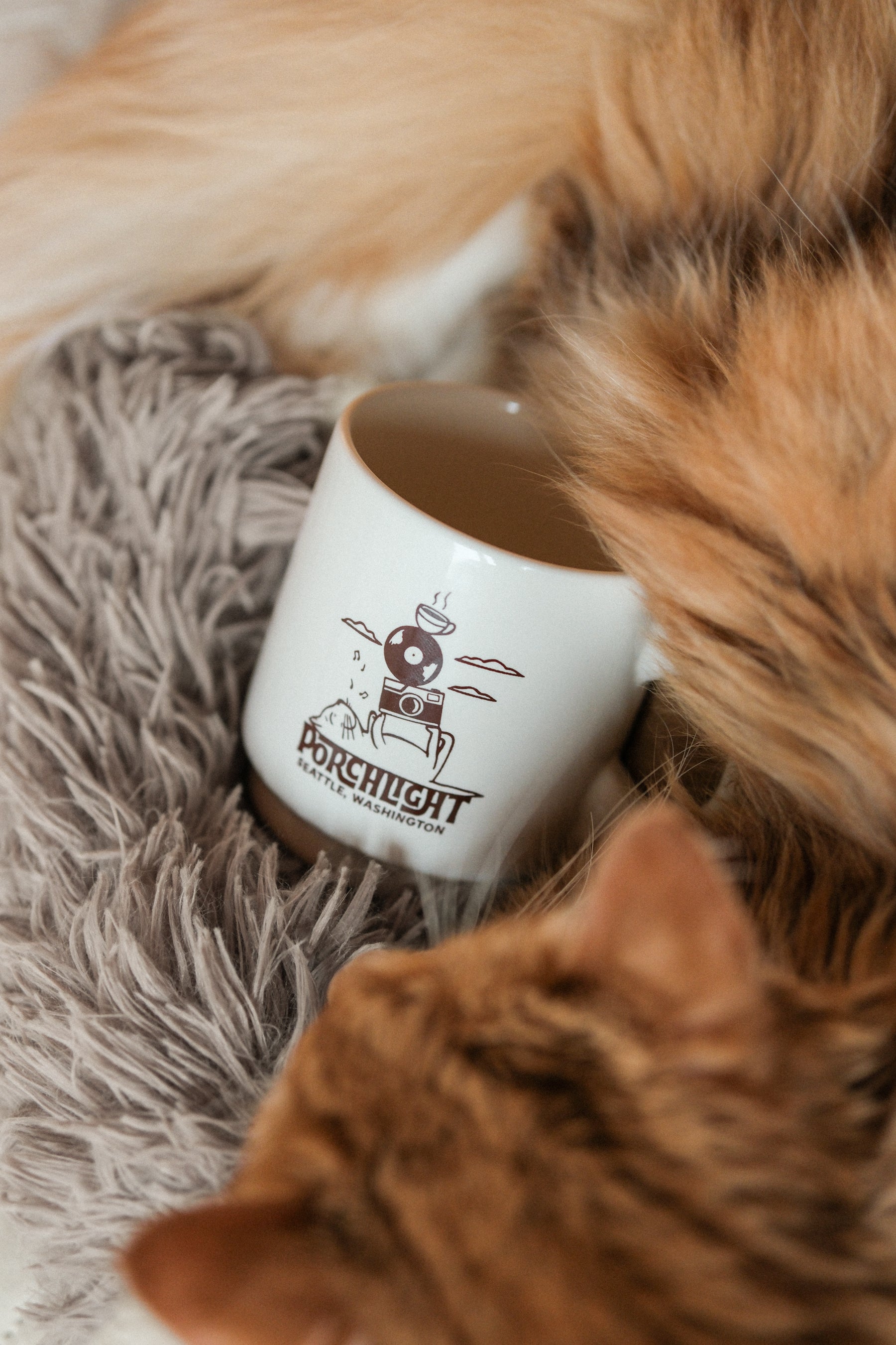 Printed in brown with four of our favorite things—a coffee cup, record, camera and a cat.