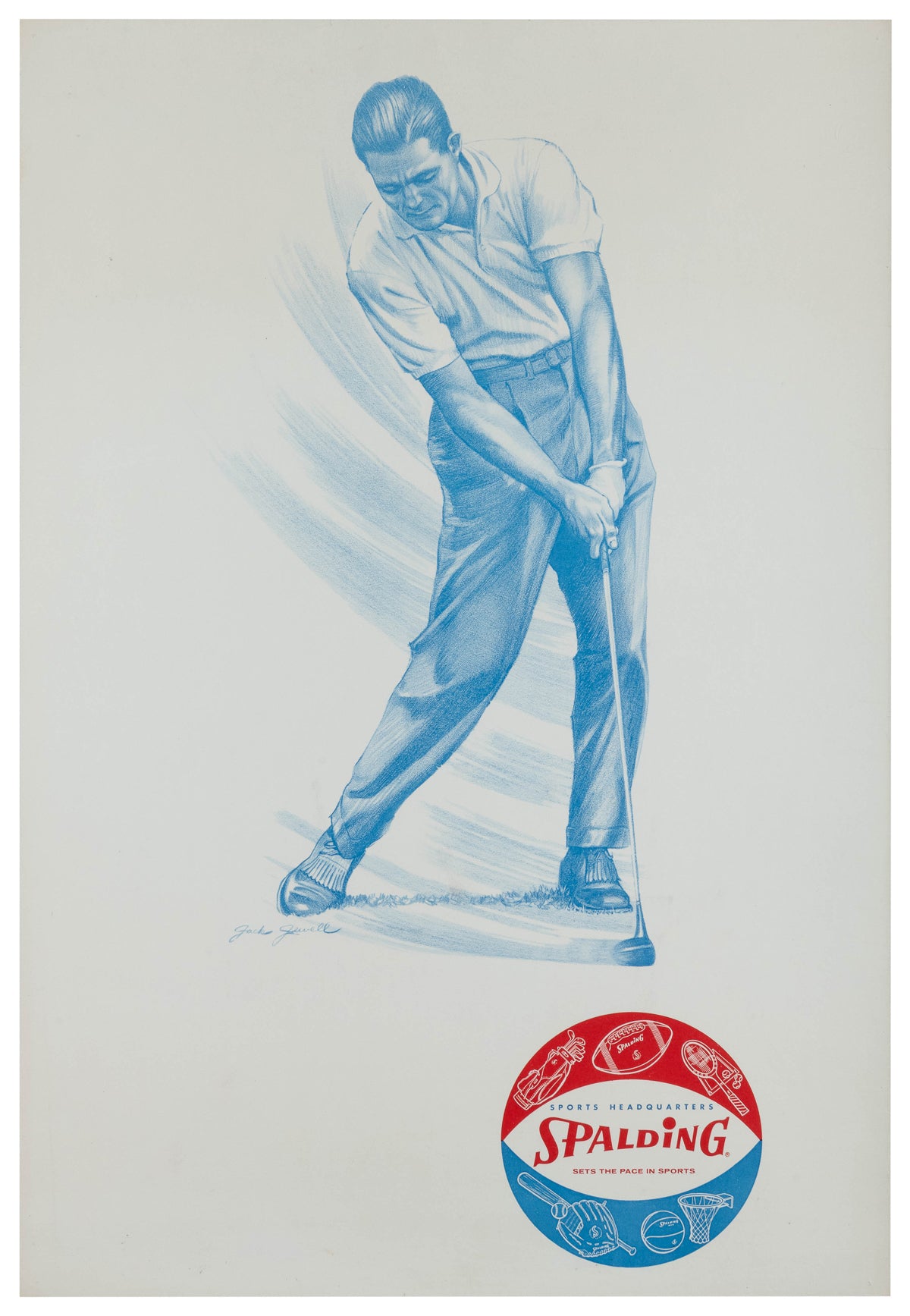 An incredibly rare poster designed by Jack Jewell for Spalding. This lithograph shows the mid-century Spalding logo in the bottom right a mid-swing golfer above. We have found very few examples of similar posters still in existence today.